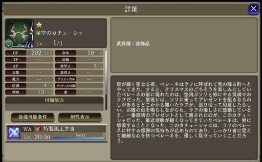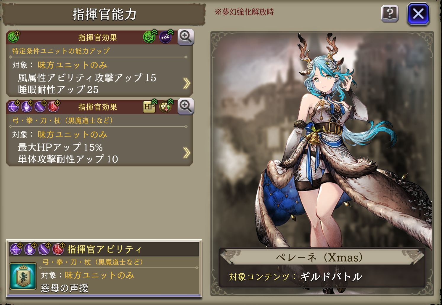 | ⇩MA2&3強化⇩ 味方の風属性ユニットのHP上限+10%・風属性アビリティ攻撃+15 自身のクリティカル率+20・範囲貫通+20・土耐性+15・治癒力+15・弱体抵抗率+30 |
