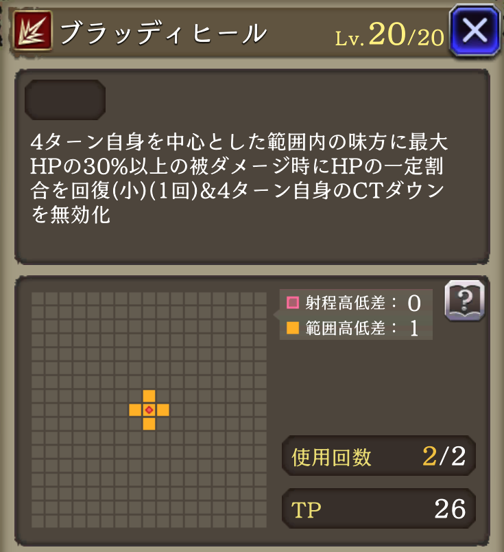 ![]() 周囲十字範囲の味方に最大HP30%以上の被ダメ時に割合回復(小・1回)を付与・自身にCTダウン無効化 | 549 |