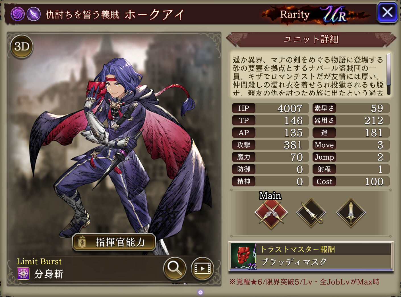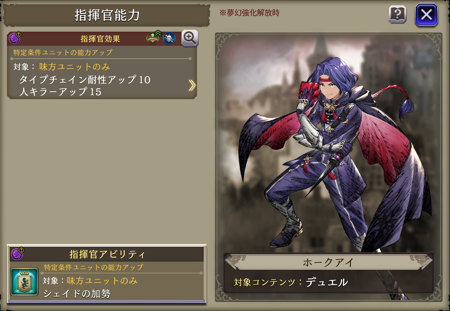| ・味方の闇属性ユニットのHP上限+10%・闇属性アビリティ攻撃+15 ・自身の治癒力+15・斬撃貫通+20 |