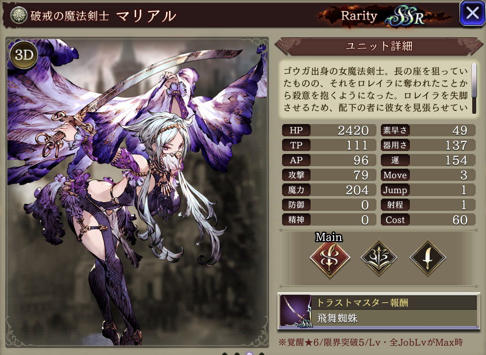 | <MA3強化後> 味方の光属性ユニットのHP上限+10%・ストップ耐性+25 自身のヘイトアップ+10、範囲攻撃耐性+15、精神+40(被ダメージ3回で解除)、HP上限+30% |
