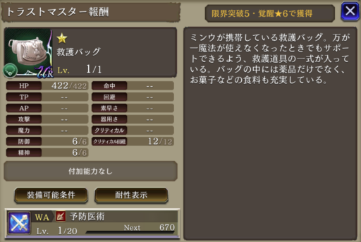 ![]() | HP上限+20% 防御+20 精神+20 治癒力+30 | 7 | |