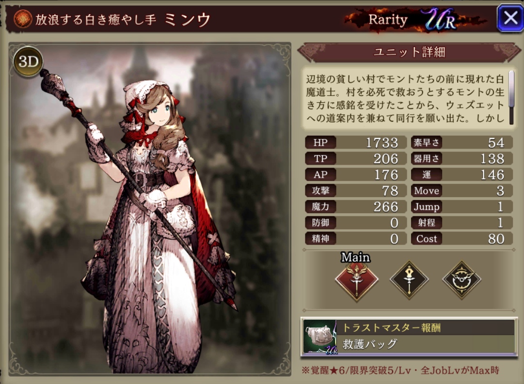 | 味方の火属性ユニットのHP上限+10%・火属性アビリティ攻撃+15、自身の魔力+25%、防御+15、治癒力+15 |