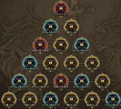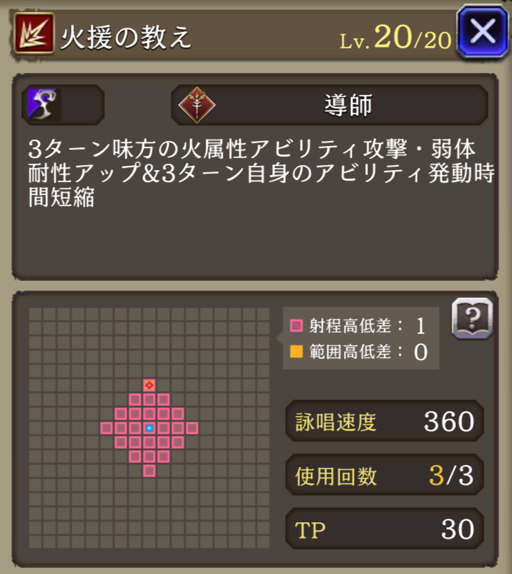 | JobLv22 火援の教え強化 | 火アビ+45に強化、アビリティ短縮400に強化 |
