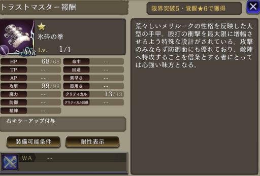 | クリティカルダメージ+40%、素早さ+10% |