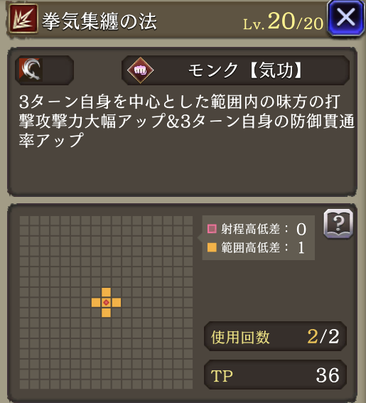 | 付加効果 | 防御貫通率+20 獲得AP+30% 拳気集纏の法 強化 自身を中心とした範囲にプロテス付与効果追加 |