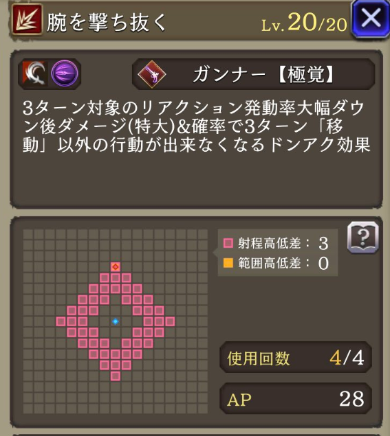 使用回数+1、射程高低差+2、ダメージ特大に強化