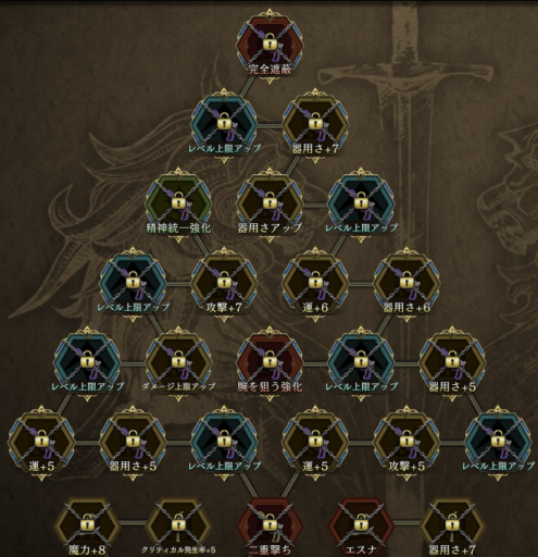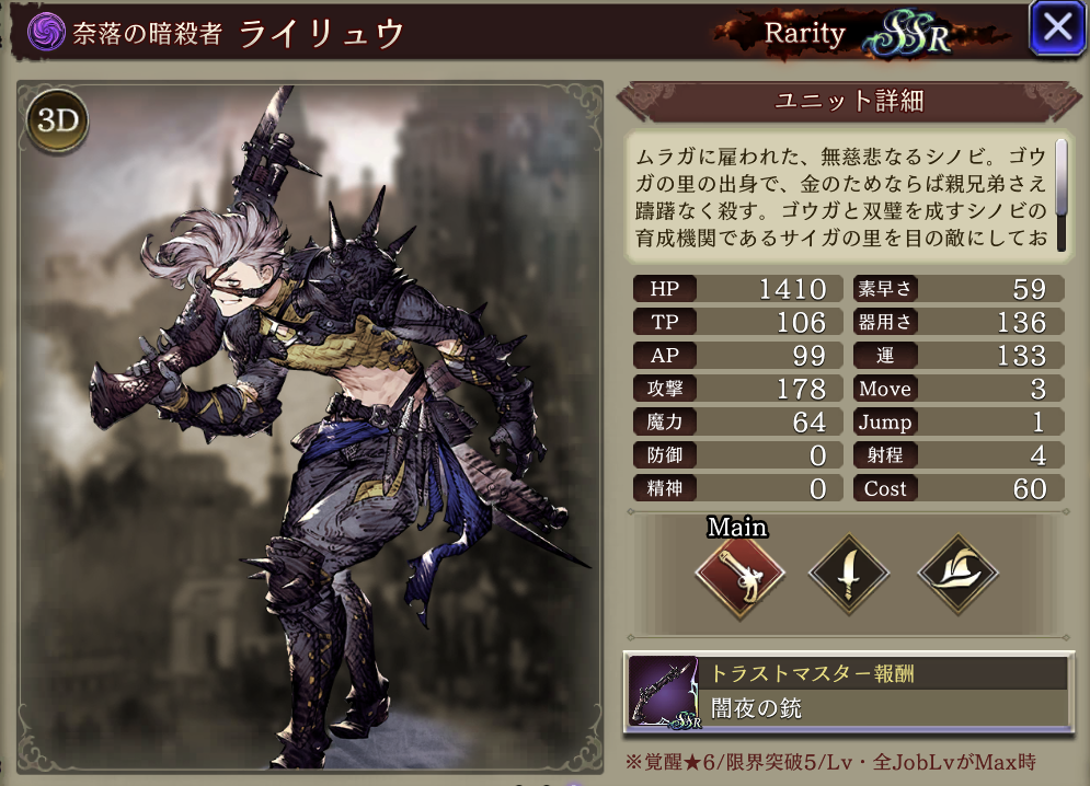 味方の闇属性ユニットのHP上限+10%・暗闇耐性+25、自身の器用さ+15%、クリティカルダメージ+15%、射程+1、防御貫通率+20、消費AP-25%