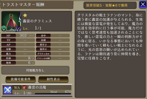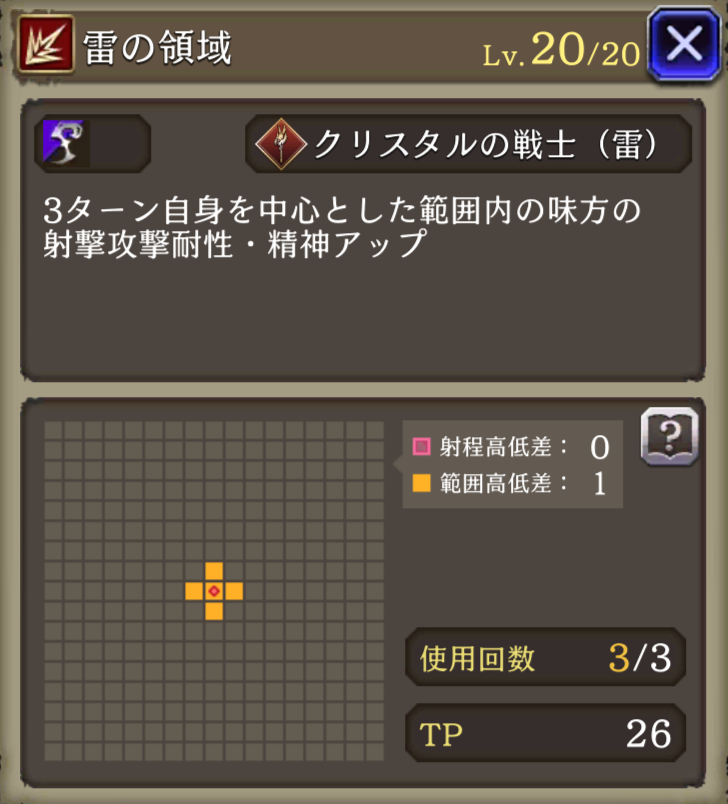 雷の息吹 ![]() | クリスタルの戦士(雷) 被ダメージ時に20%確率で自身のHPを回復(小) |