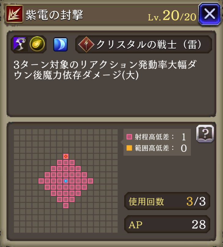 | ⇩MA3強化⇩ 味方の雷属性ユニットのHP上限+10%・雷属性アビリティ攻撃+15 自身の範囲攻撃耐性+10、アビリティ発動時間-40%、素早さ+10%、刺突耐性20、魔法貫通+30 |