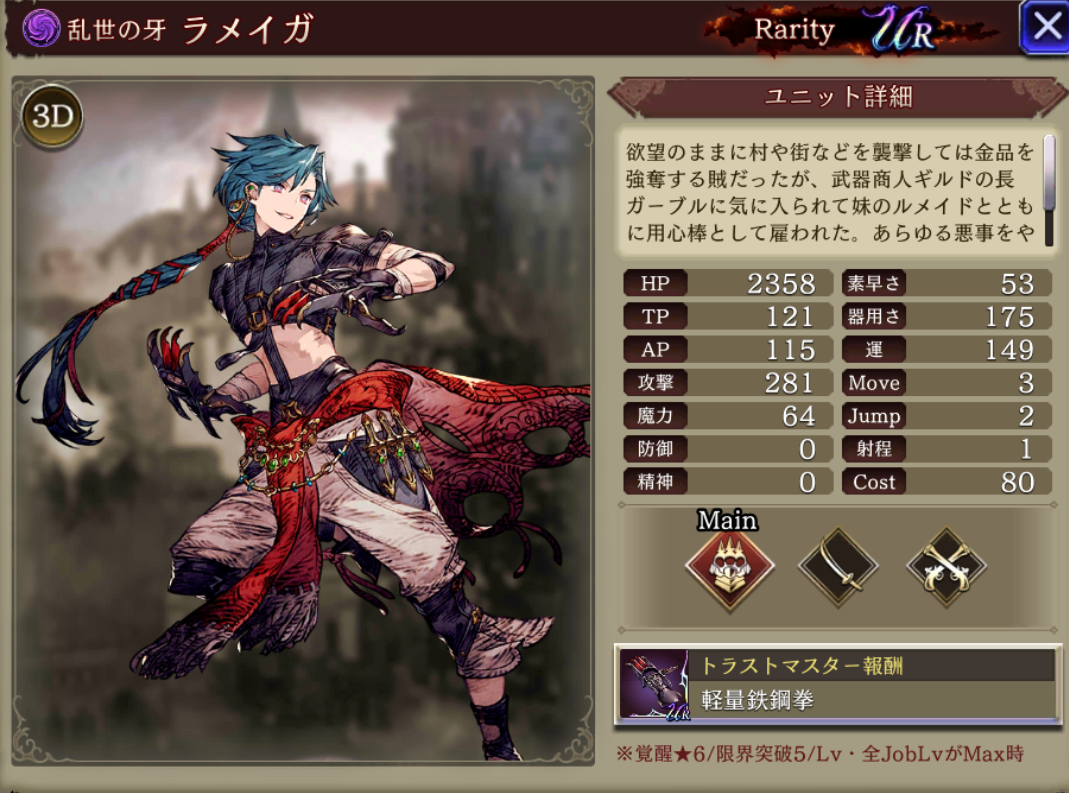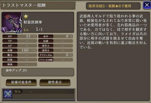 | (Lv50) | 射撃耐性+10 回避+10 ※ラメイガ限定 運+30% 闇属性アビリティ攻撃+15 AP消費率20ダウン |