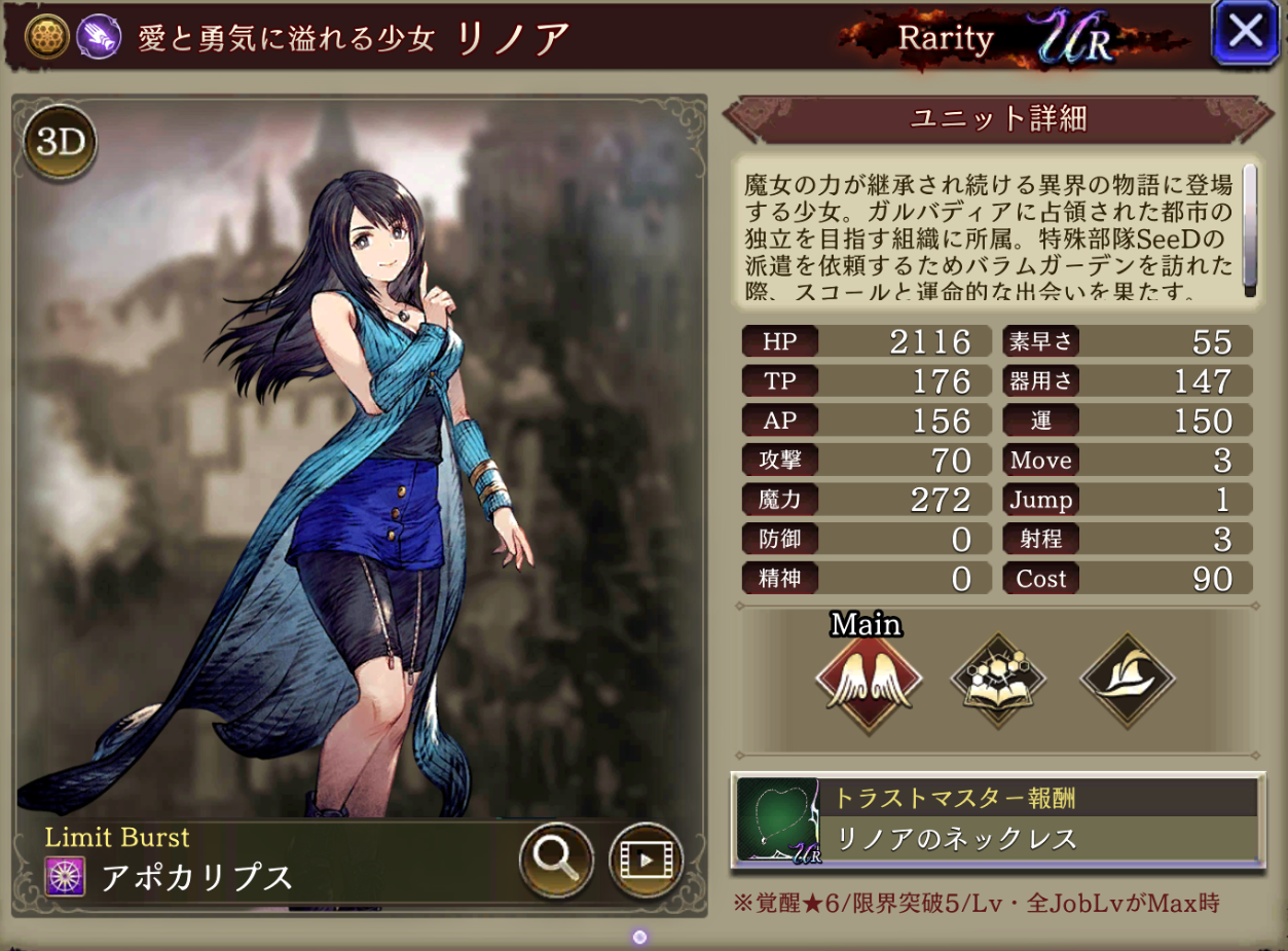 | 味方の土属性ユニットのHP上限+10%・土属性アビリティ攻撃+15、自身のアビリティ発動時間-20%、雷耐性+15 |