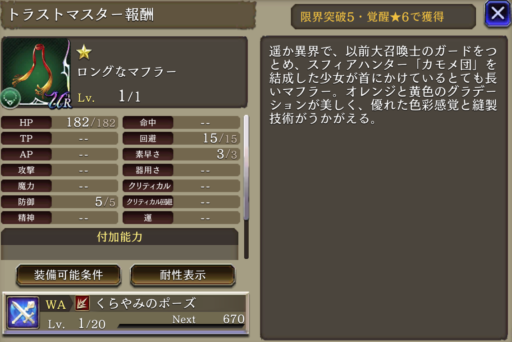 単体耐性+10、クリティカルダメージ+15 クリティカル回避+15 戦う(連)を強化 使用回数+1、エレメントチェイン耐性30ダウン効果追加 | 物理系 回避 |