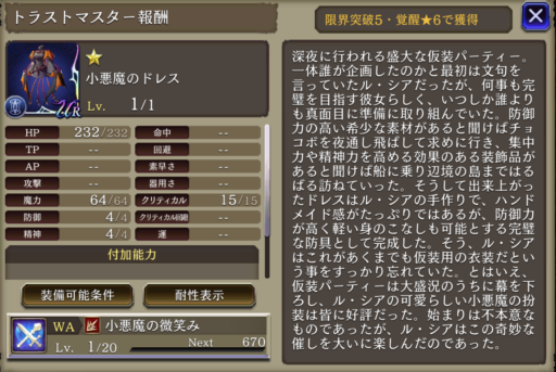 自身のHP上限+5%、範囲耐性+15、魔法攻撃耐性貫通率+40、クリティカル回避率+20