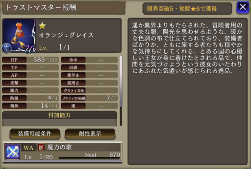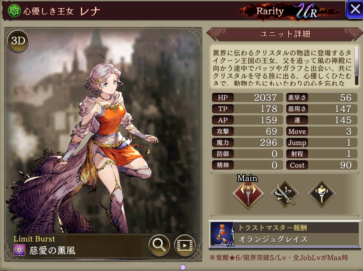 | Lv50 | 治癒力+15 レナ限定: 最大HP+15%、魔力+30%、素早さ+8% |
