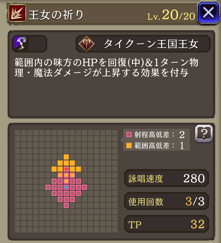 | 「タイクーンの護り」 範囲が十字→菱形に、自身にヘイト-5 &被ダメージ30%軽減効果(被ダメ3回で解除) 範囲内の味方に精神+40、プロテス解除封印付与 |