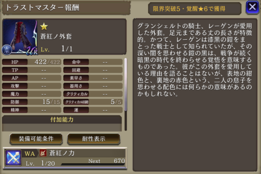 | Lv50+5 | 防御貫通率+20 火・氷属性限定: 斬撃耐性貫通率+20、HP20%以下でCTアップ(小) |