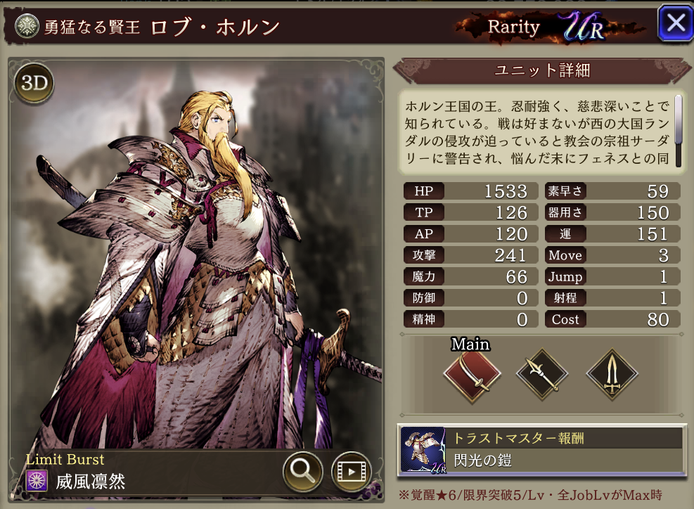 | ⇩MA3強化⇩ 味方の光属性ユニットのHP上限+10%・光属性アビリティ攻撃+15 自身のクリティカル発生率+10、回避率+15・防御貫通率+20 自身が掛けた強化の効果ターン+1 |
