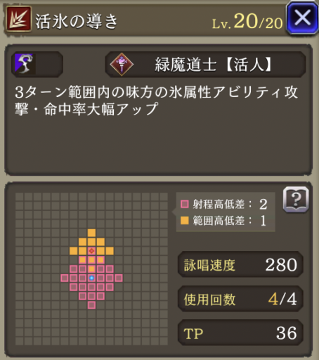 | JobLv25 活氷の導き習得 | 3ターン範囲内の味方の氷アビ+40、命中+60 |