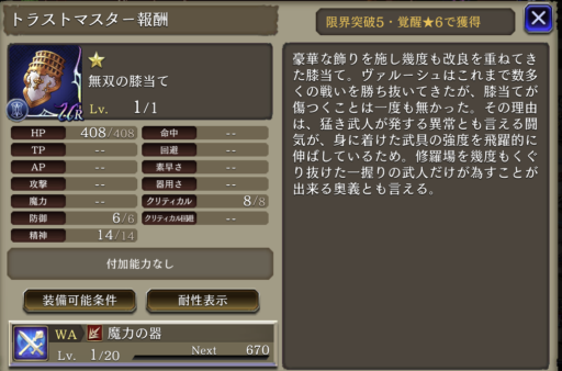![]() | 魔法バリア(HP7500) 斬撃貫通率+40 | 6 | |