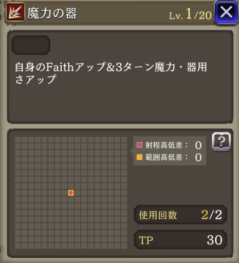 | JobLv25 奪魂の太刀習得 | 範囲内の対象に魔力依存ダメージ(中)&与えたダメージの30%吸収 |