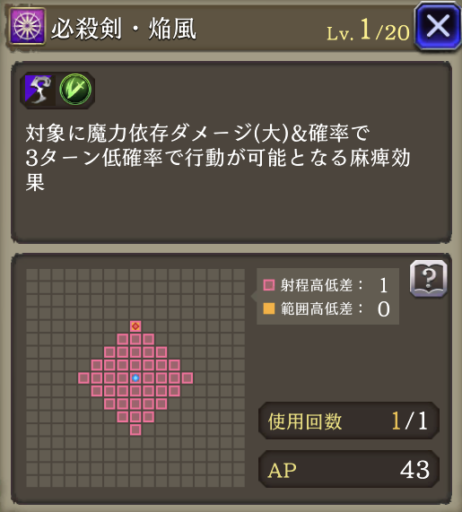| 「封反の一刀」 使用回数&射程+1、命中+30→70に 与ダメージ50%吸収効果追加 対象のクリティカル回避率25ダウン 自身にリジェネ |