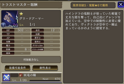 ![]() | 攻撃+42% クリティカル率+25 リアクション阻止率100 | 6 | |