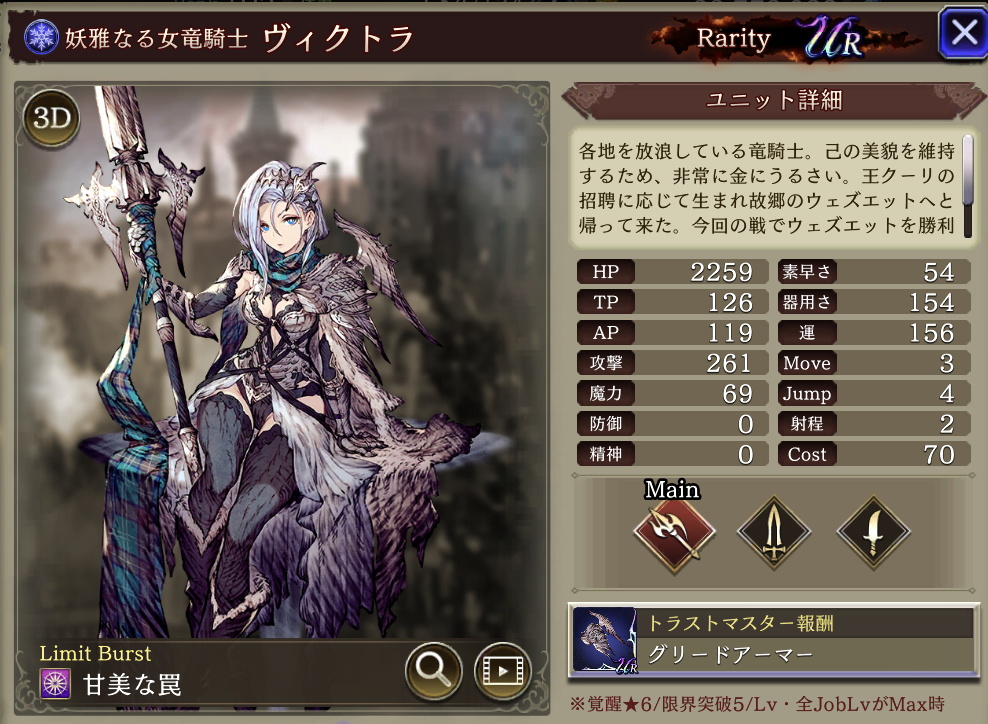 | ⇩MA3強化 味方の氷属性ユニットのHP上限+10%・氷属性アビリティ攻撃+15 自身の刺突攻撃+10、アビリティ発動時間-20%、防御貫通率+40、バトル開始時ダメージを完全に防ぐバリアを張る(2回) |