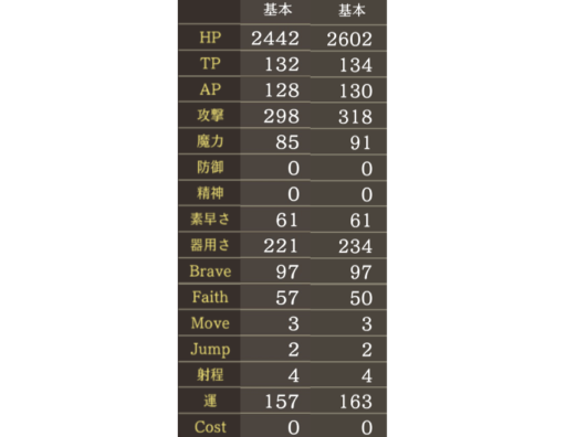 ※全てアビリティLV.MAX、Brave/Faith値MAXの値