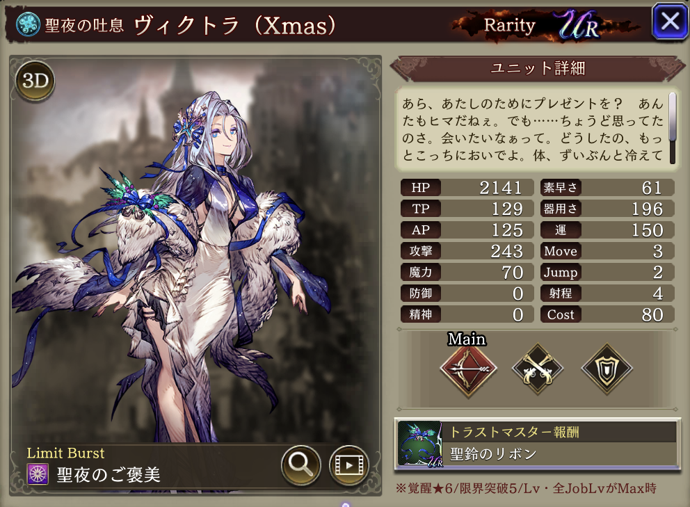 | 味方の水属性ユニットのHP上限+10%・水属性アビリティ攻撃+15、自身の消費AP-20% |