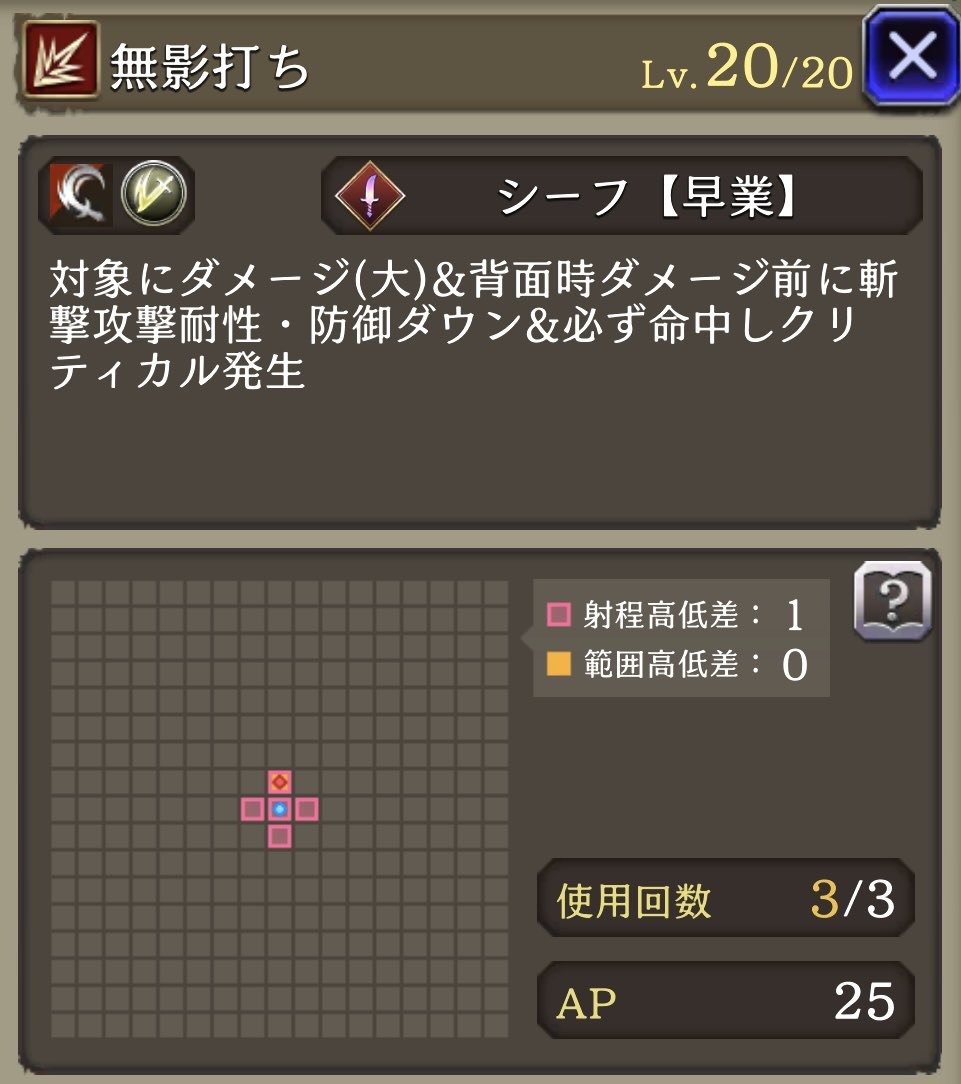 | 「シーフの心得」(サポアビ) 攻撃前3T単体耐性20ダウン効果・バトル開始から10T魔力依存攻撃回避(被ダメ3回で解除) |