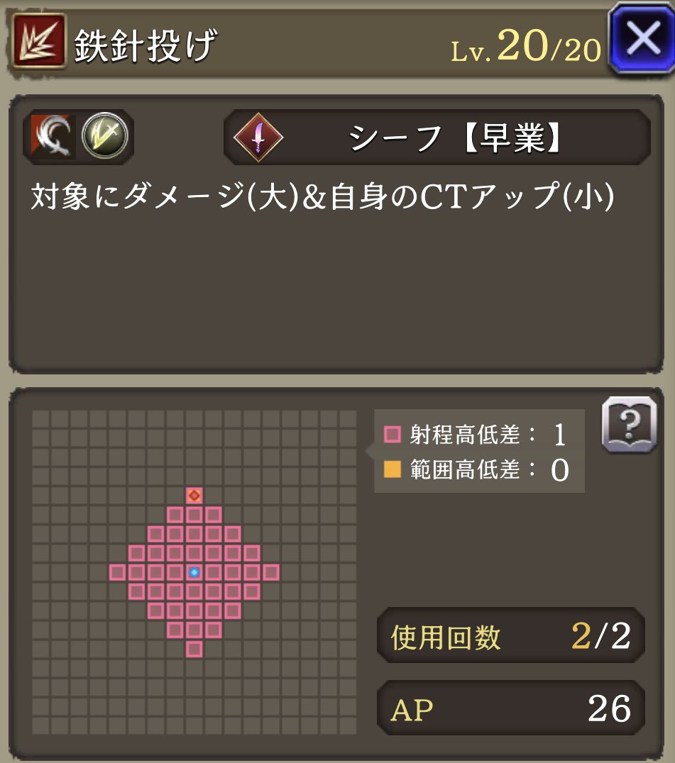 【②転生強化】 防御貫通+10、物理ダメージ上昇10% 回避+10 【①夢幻強化】 魔法回避率+20、素早さ+10% 「鉄針投げ」 強化 CTアップ小→中に&単体耐性ダウン効果追加 | 物理系 回避 |
