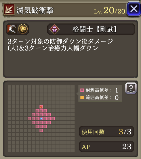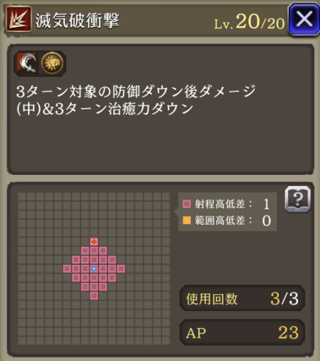 | JobLv25 滅気破衝撃習得 | 3ターン対象の防御20ダウン後ダメージ(中)&3ターン治癒力50%ダウン |
