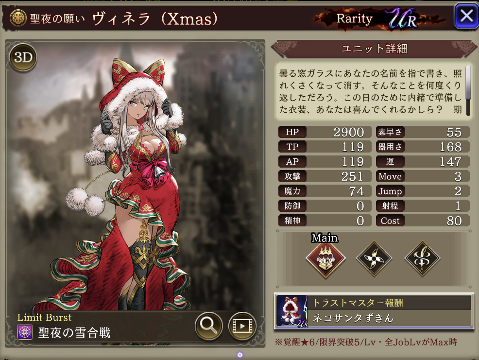 | 味方の土属性ユニットのHP上限+10%・土属性アビリティ攻撃+15、自身の攻撃+20%、自身の攻撃+40%、リアクション阻止率+40 |