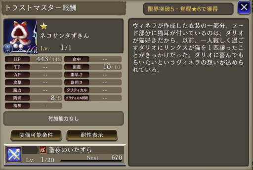 | 付加効果 | 単体攻撃耐性アップ10 魔法攻撃耐性アップ10 滅気破衝撃強化 射程+2 |
