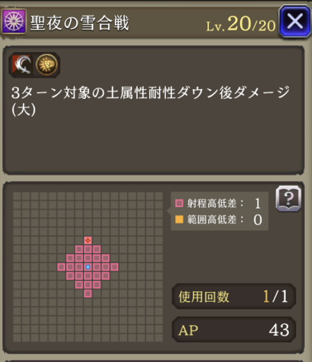 ![]() | 【EXラストアビ】 防御20ダウン 治癒力70%ダウン 【夢幻強化後】 射程+2 | 2 | 14 |