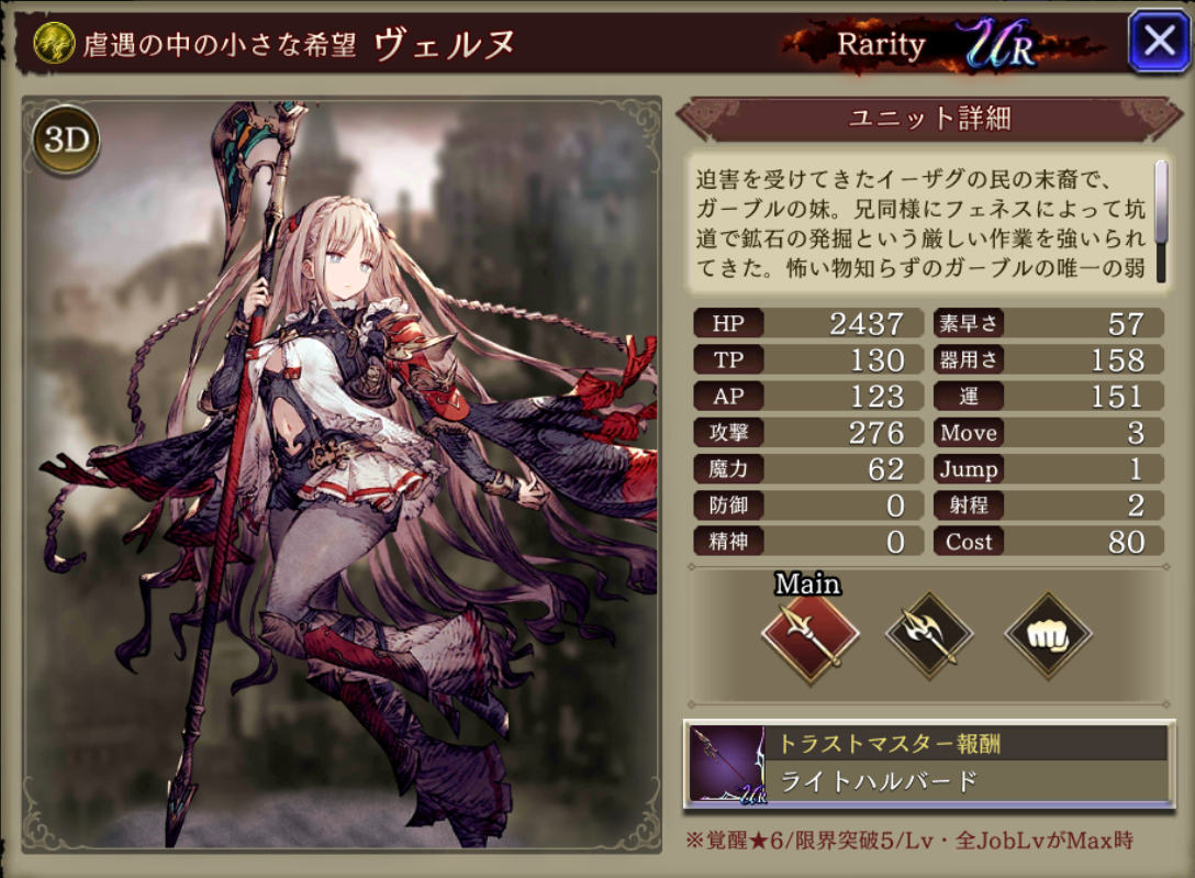 | (+5 Lv50) | 単体耐性+10 ※ヴェルヌ限定 防御貫通率+20 物理攻撃時人キラー15 防御弱体耐性+100 |
