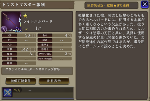 ![]() | 攻撃+42% クリティカル率+25 リアクション阻止率100 | 6 |