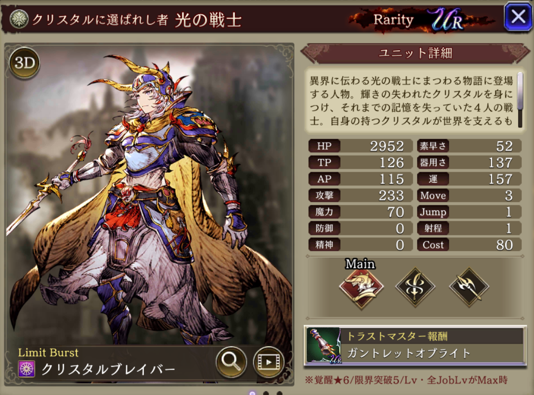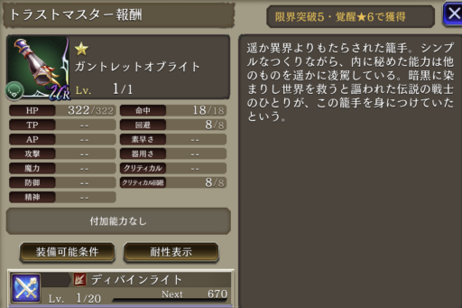![]() | 攻撃+42% クリティカル率+25 リアクション阻止率100 | 6 |