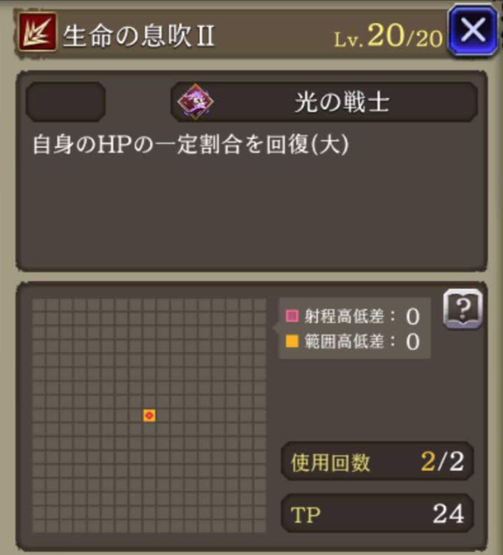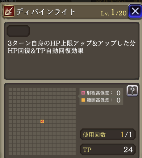 | JobLv25 シャインソード 習得 | 範囲内の対象にダメージ(中)&3ターン自身にリジェネ |
