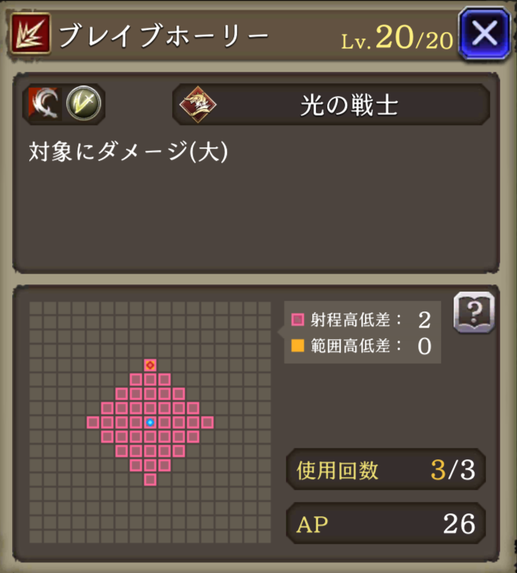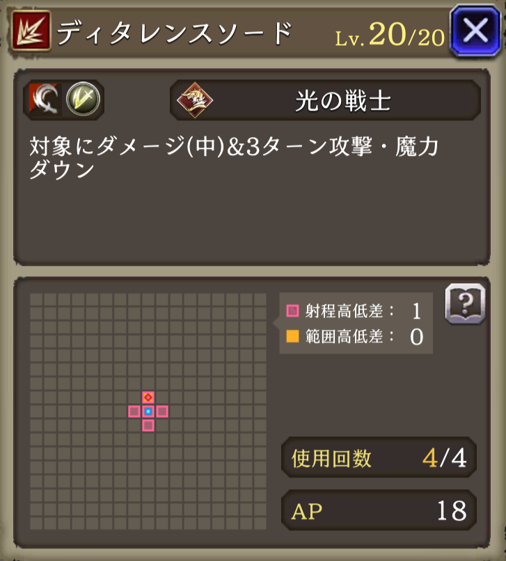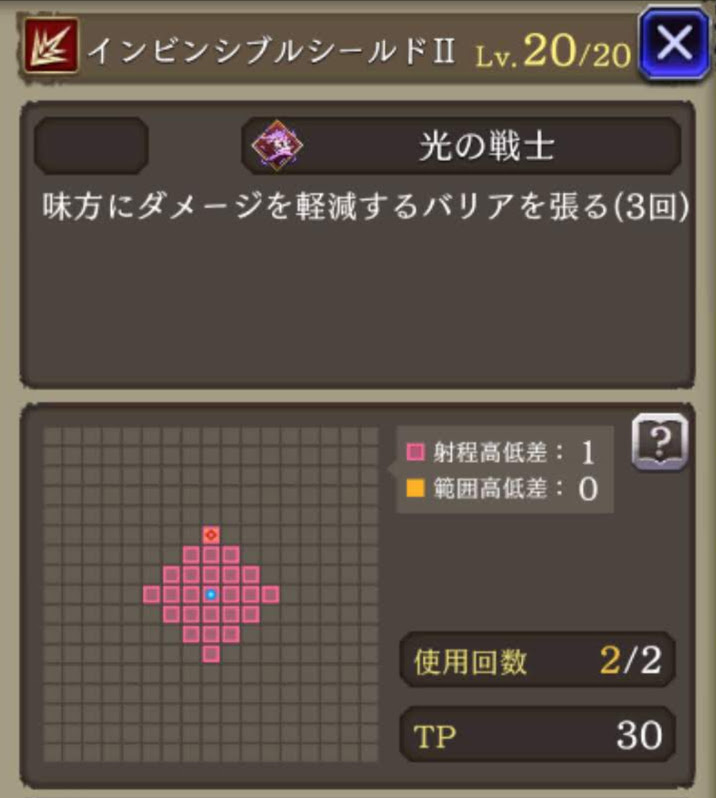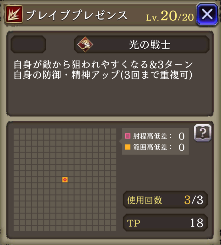 戦士の誇り ![]() | 光の戦士 物理攻撃による被ダメージ時に20%の確率で3ターン防御+10 |
