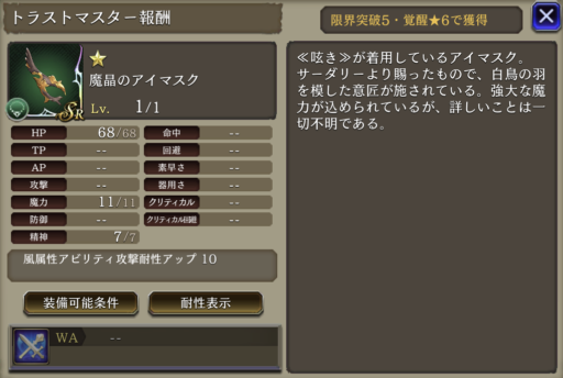 | ⇩MA3強化⇩ 魔力+20%、全攻撃タイプ耐性+10、魔法攻撃力+10、HP上限+800 |