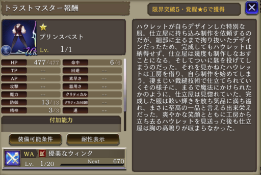 天賦の才能 ↓ 天才の剣技 | 魔力+24%、斬撃耐性貫通率+40&攻撃命中時ヘイスト解除 |