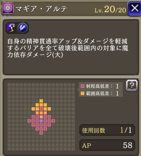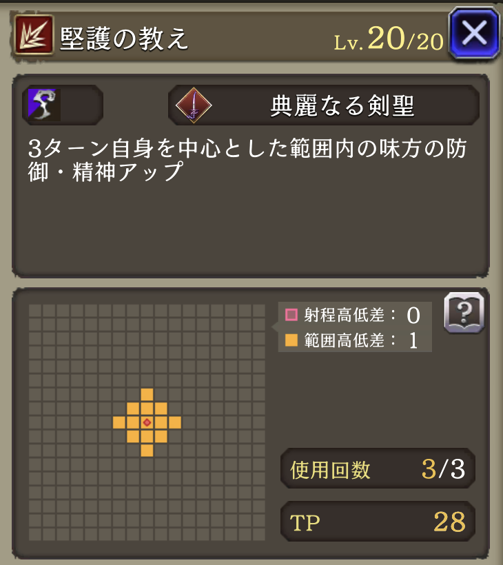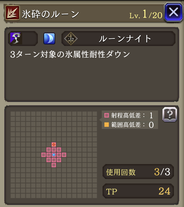 | ⇩MA3強化⇩ 味方の氷属性ユニットのHP上限+10%・氷属性アビリティ攻撃+15 自身の魔力+10%、範囲耐性+15、斬撃・魔法耐性+10、命中率+15 |