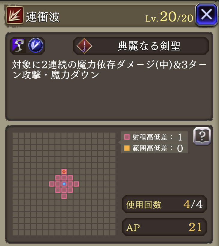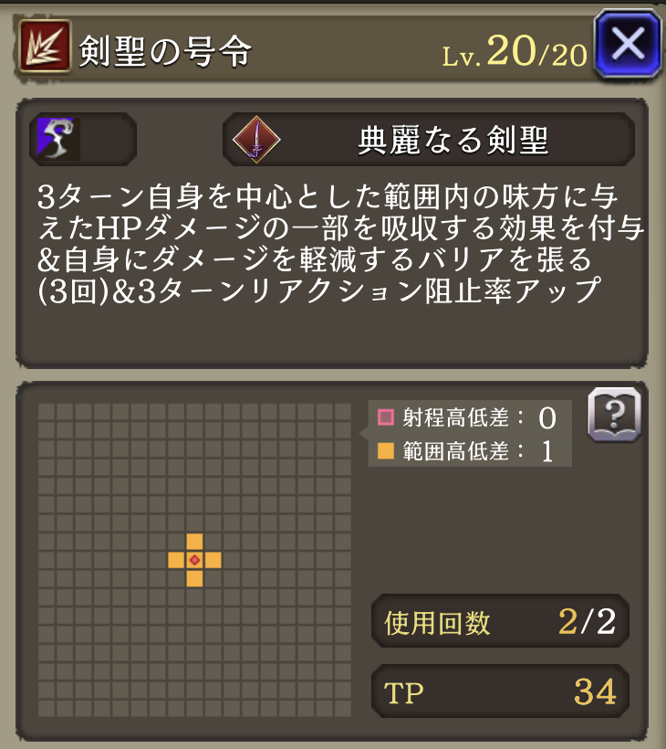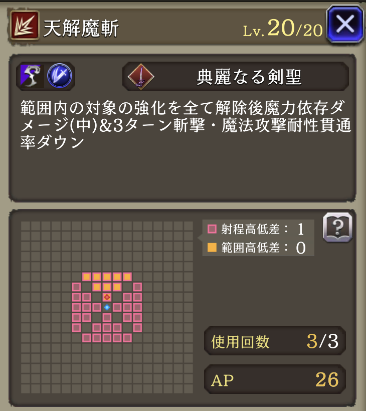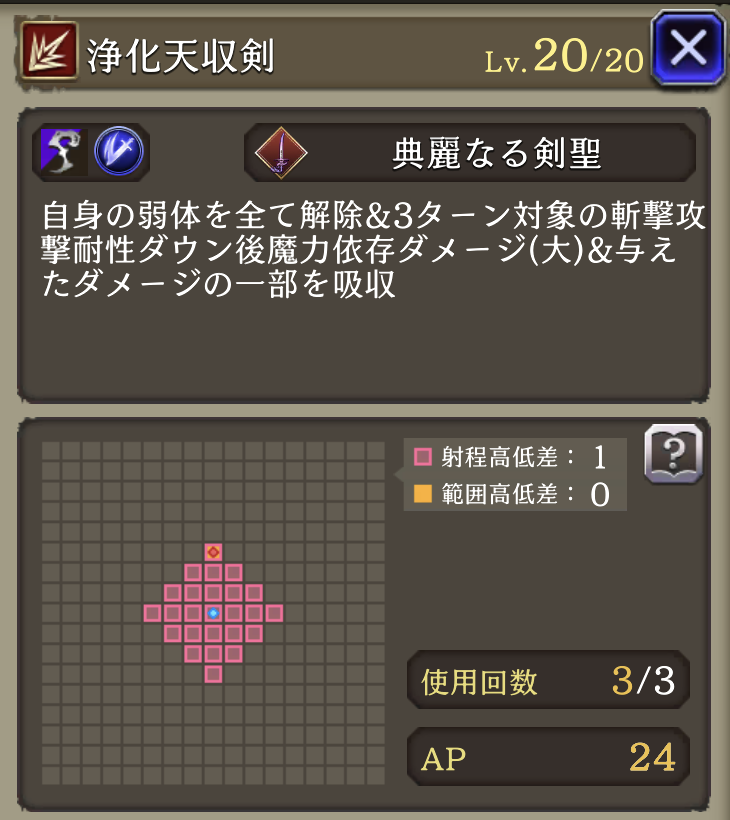 | ①「剣聖の号令」(Ex) 効果4ターンに <味方>ブースト(リアクション阻止率+50、物魔被ダメ軽減20%付与) <自身>HP50%以下で全弱体解除・HP回復 ②「天解魔斬」 使用回数+1、弱体抵抗率100ダウン、HP吸収追加 物魔被ダメ軽減貫通40%ダウン 物魔被ダメ上昇30%付与 |