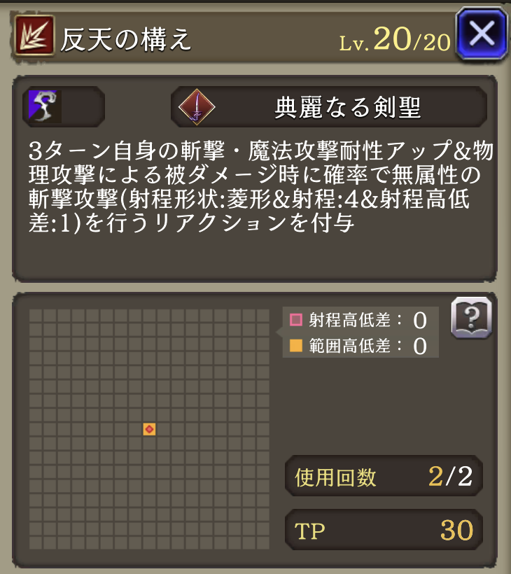 反天撃 ![]() | 雅麗の騎士 「反天の構え」使用後3ターン 物理による被ダメージ時に80%の確率で無属性の斬撃攻撃 |