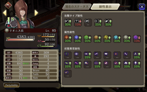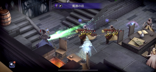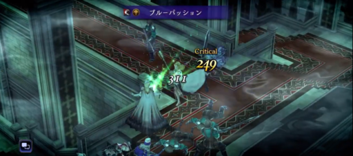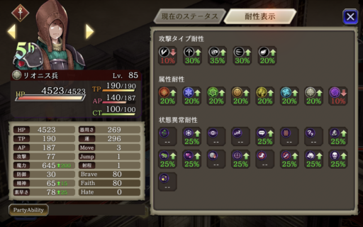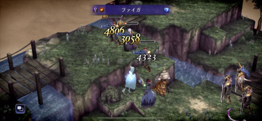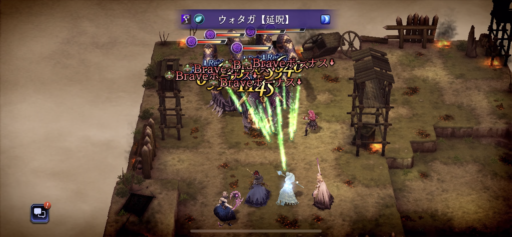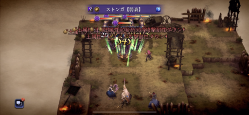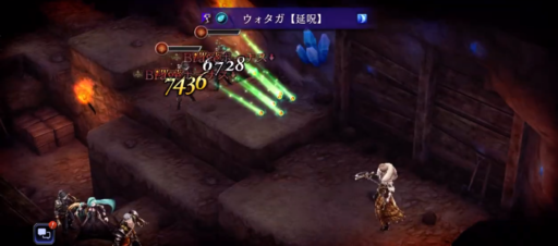 パーティは回避を上げてますがなかなか回避し辛くなってきました。魔法攻撃や呟きを使って、敵の「属性弱点」や「攻撃タイプ」弱点を突いて効率よくダメージを与えます。 崖上の狩人・フェデリカの「狙い打ち」など射撃が痛いので速攻で相性の良い呟きで倒しに向かいます。