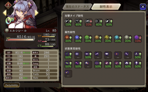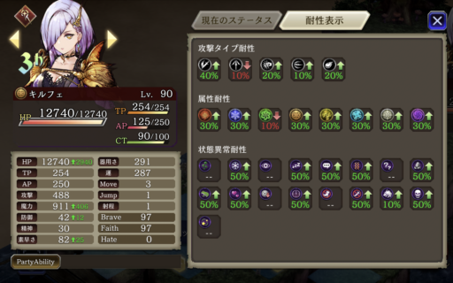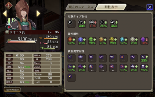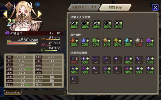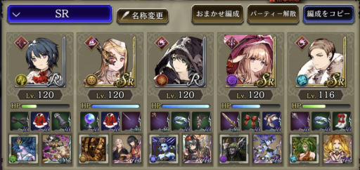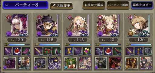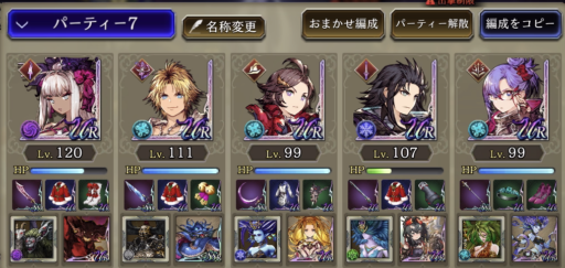 ![]() 敵のブルーパッションをなんとか避けるために強引に回避させていくパーティです。中でもユニの回避を一番盛って、装備でヘイトアップも付けています。 敵の属性に合わせて火と水を多めに編成 |