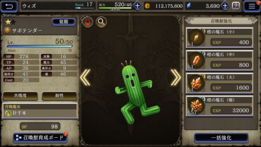 ▲上がLV50まで強化済みの召喚獣ですが、初めてこの召喚獣をセットしたときは召喚獣のステータスが1/10だけユニットに乗ります。