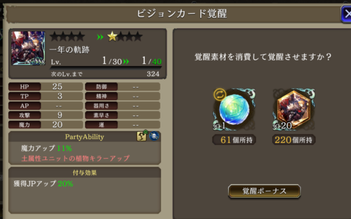 APが上がる珍しいビジョンカード。初期APが少ない物理アタッカーにおすすめ◎最大で初期APが5くらい上がる。