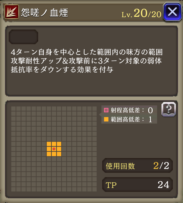 ![]() 4T自身を中心とした正方形周囲の範囲耐性+20、攻撃前に3T弱体抵抗率30ダウン | 526 |